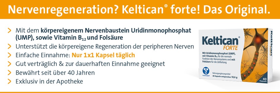 Keltican® forte aktiviert und unterstützt die körpereigene Regeneration der peripheren Nerven mit essentiellen Nervenbausteinen. Die einzigartigen UMP-B-Pellets mit der Kombination aus Uridinmonophosphat (UMP), Vitamin B12 und Folsäure optimieren die Nährstoff-Versorgung des Körpers für die Nervenregeneration.
