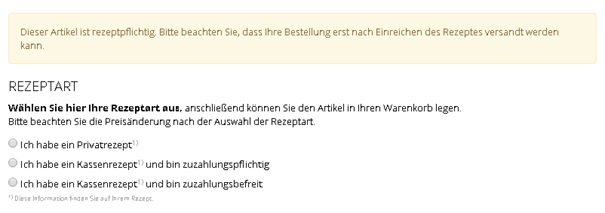 1.4. Wählen Sie hier die vorhandene Rezeptart aus. Sobald Sie eine Option gewählt haben erscheint der „Kaufen“-Button für dieses Produkt. Mit einem Klick auf den „Kaufen“-Button können Sie nun auch den verschreibungspflichtigen Artikel in Ihren Warenkorb legen.